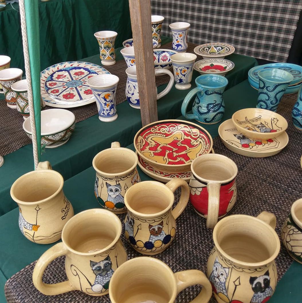 High-fired Medieval-inspired hand-made functional pottery, and some SCA-adjacent textile items. |